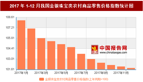 2017年1-12月我国金银珠宝类农村商品零售价格指数统计表