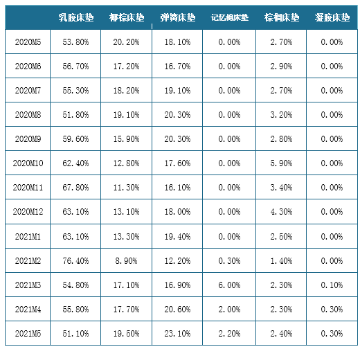 乳胶床垫2021年5月份额51.1%,同比-2.7%,环比-4.7%;椰棕床垫2021年5月份额为19.5%,同比-0.7%,环比+1.8%;棕榈床垫2021年5月份额为2.4%,同比-0.3%,环比+0.1%;弹簧床垫2021年5月份额为23.1%,同比+5%,环比+2.5%;记忆棉床垫2021年5月份额为2.2%,同比+2.2%,环比+0.2%;凝胶床垫2021年5月份额为0.3%,同比+0.3%,环比持平。