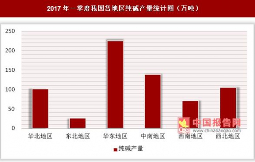 据统计,2017年一季度,纯碱生产主要分布在中南地区,总计15545万吨,占总产量52.1%。