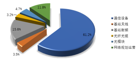 从产业链来看,通信设备是上游产业链中非常重要的一环,预计5G时代上游环节中投资额最多的便是通信设备领域,其投资占比超过60%,具体各上游领域投资额占比大致如下: