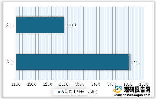 2021年4月我国游戏行业中男性用户月人均使用时长高于女性。根据数据显示,男性用户月人均使用时长为150小时,高出女性用户20.2小时。