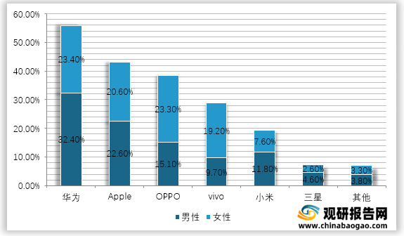 男女用户对于手机终端品牌的选择差异性较大,男性用户更加集中在华为、苹果等品牌,相比之下,女性用户更加偏爱OPPO、vivo。