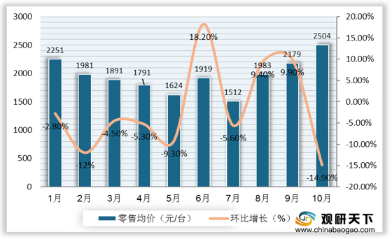 2020年10月,我国冰箱线上市场整体均价为2504元/台,较上月增加325元/台。细分来看,多门和两门冰箱市场均价环比增幅最大,分别为8.47%、7.25%。