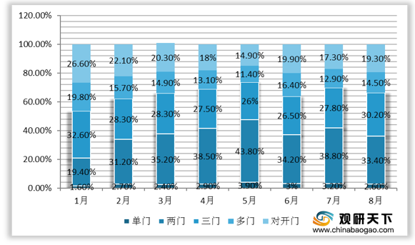 从门数销量来看,2020年10月,在我国冰箱线上市场中,对开门及多门冰箱的市占分别达24.2%、20.8%,并已经实现市场份额连续四个月增长;单门、两门冰箱的市占分别为2.1%、25.4%,并且市场份额连续四个月下降;三门冰箱虽然市场份额也在持续下跌,但是占比仍为最大,达27.5%。