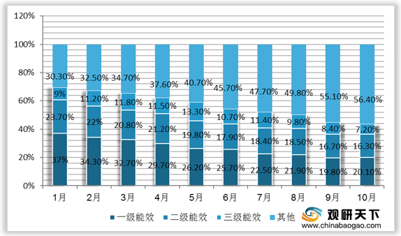 从线上市场能效销量来看,2020年10月,一级、二级和三级能效的冰箱销量占比分别为20.1%、16.3%、7.2%,其中,一级能效冰箱市占较上月略有回升,而三级能效冰箱市占已经四个月连跌。