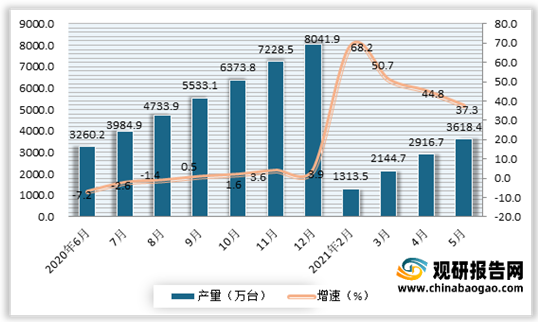 2020年6月-2021年5月我国家用洗衣机月度产量情况