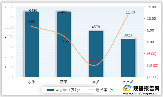 农产品主要分为水果、蔬菜、肉类和水产品四大类,其中水果、蔬菜的冷链物流需求较大。根据数据显示,2019年我国农产品中水果类冷链物流需求量为6480万吨,增长率为6.60%;蔬菜类冷链物流需求量为6480万吨,增长率为2.50%。