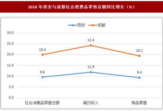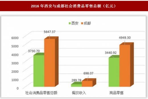 西安与成都,一个是中国西北地区的商贸中心,一个是中国西南地区的商贸中心,从消费品市场来分析,受城市发展规模的制约,2016年,西安市社会消费品零售总额的总量及增速均低于成都:社零总额相当于成都的66.1%,增速较成都低0.8个百分点。
