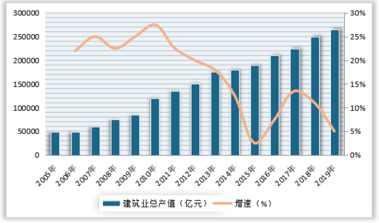 2019年我国建筑行业总产值约为265000亿元,同比增长为5%。