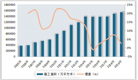 2019年我国建筑行业施工面积约为1500000万平方米,同比增长为2.5%。