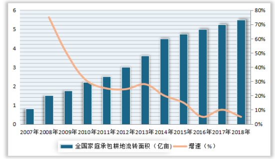 2018年全球家庭承包耕地流转面积约为5.5亿亩,同比增长5%。