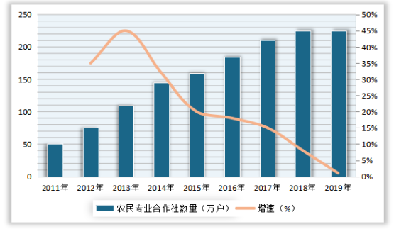 2019年我国农民专业合作社数量约为225万户,同比增长1%。