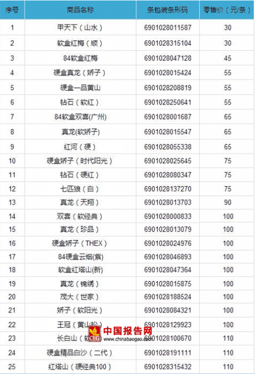 2017年8月北海市卷烟零售价格表
