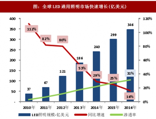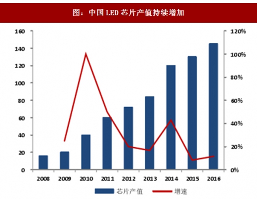 2016年,LED小间距、通用照明、汽车照明等市场持续增长,对LED芯片需求增加。LED芯片厂商多次上调产品价格应对供不应求的市场情况。