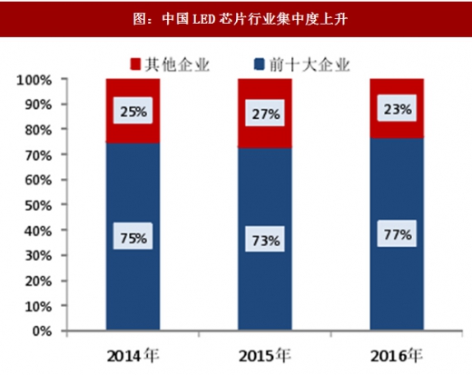 LED行业经过多年洗牌,没有技术积累从而提升生产效率的中小企业逐渐被淘汰。2015年下半年至2016年初市场竞争激烈,技术领先和成本较低的大厂主动降价,小厂被迫关停产线。这些小厂设备老旧,没有能力升级设备和技术,成本较高,只有退出LED行业。国内LED芯片环节能够持续盈利的企业只剩下少数几家,面对中下游需求的持续增长,技术领先的一线企业一致做出扩产的决定,行业集中度将进一步提升。