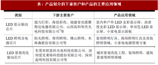 下游客户或终端客户主要为生产LED 显示屏、LED 照明和LED 景观亮化类产品的企业,按产品划分的下游客户和产品的主要应用领域如下所示: