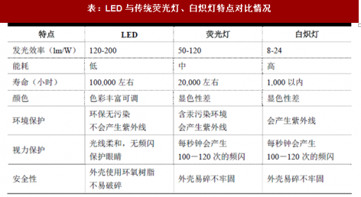 与传统光源相比,LED 光源具有使用寿命长、节能性能优异、色彩丰富等优点;相较于节能灯,LED 灯因具备更优异的节能性能,而更有竞争力。LED 成为公认的最节能、环保的新型光源,LED 照明产品正逐渐成为照明终端市场的主流选择方案,应用前景极其广阔。