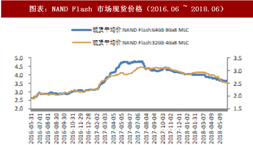 以存储器市场的主要产品 DRAM 和 NAND Flash 的现货价格看,前者从 2018 年年初开始了短线的下行周期,而后者的短期见顶时间更早,基本上从 2017 年第三季度末就已经开始了下降趋势。可以看到的是,在经历了从 2016 年下半年开始的上行周期后,存储器市场的高景气度短期内进入了下行的趋势,这反映了终端产品厂商对于芯片部件库存已经到达了较高的水平。