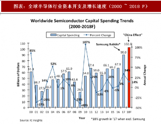 半导体市场总体的资本开支情况能够反应行业整体从业人员对于产业的态度,市场研究机构 IC Insights 在 5 月发表的报告上修了全球资本开支的情况,上修 2018 年全年增速至 14%,并且预计整体的投入规模将会超过 1,000 亿美元。值得注意的是,IC Insights 给出的上修理由主要是由于三星、海力士、美光等存储器厂商持续的扩张预期,以及来自于中国大陆的资本开支需求,从上图中可以看到,2018 年作为连续上升的第二年,其核心因素为“China Effect”,反应国内市场的影响力持续加大。