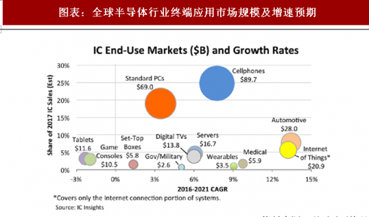根据 IC Insights 的数据看,尽管以beplay下载软件 手机为代表的消费电子仍然占据了半导体市场终端需求的较大份额,但是值得关注在未来 5 年的复合增长率预期方面,汽车电子和物联网行业的增长速度是快的。