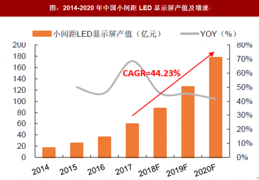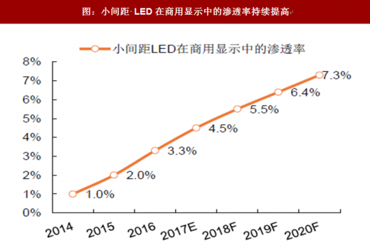 此前,小间距显示屏市场的爆发主要集中在政府部门显示领域,随着小间距 LED 显示屏技术成熟和价格持续下降,2017 年下半年开始在商用显示领域快速渗透,未来几年内小间距 LED 显示屏在商用显示领域的市场规模将迅速增长。预计到 2020 年小间距 LED 显示屏在商用显示中渗透率将达到7.3%。另一方面,紫外,红外光和车载照明的等市场的应用也推动 LED 市场的需求增长。