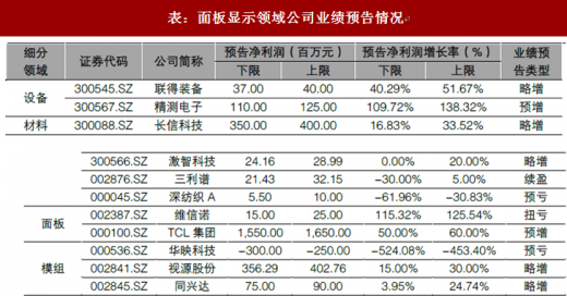 在发布业绩预告的面板显示产业链公司中,有 7 家实现业绩增长,与行业整体水平基本持平。其中,设备和材料企业受益于近几年面板产线投资高峰,获利表现较高,如联得装备预增 40%-52%,精测电子预增 110%-138%。但是,从 2017 年以来,新建 LCD 高世代面板厂陆续量产和爬坡,全球 LCD 面板的产能释放,而短期内全球包括中国的电视整机需求幵没有有效提升,事季度面板的过剩率达到 9%,电视面板价格从 2018 年年刜以来整体跌幅达 30%。7 月上旬,32 英寸、39 英寸和 42 英寸价格出现 1%左右的上涨,43 英寸、55 英寸等面板价格止跌。我们认为短期内止跌是下游显示厂商备货驱动,到今年年底及明年一季度,随着 10.5 高世代面板产能的释放,预计大面板价格将维持下跌趋势。