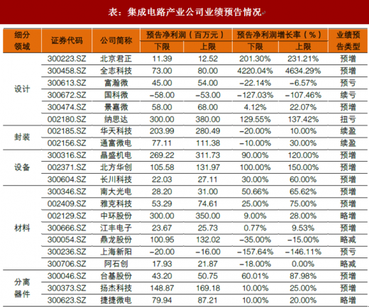 在已发布预告的 21 家集成电路产业链公司中,有 16 家实现业绩增长。其中,增速排名第一的是全志科技,2018Q1 年归母净利约为 0.73 亿元-0.80 亿元,同比增长 4220%-4364%,主要受益于beplay下载软件 音箱、家居类产品以及车载产品芯片出货量增长。受益于国产设备导入加速,北斱华创、长川科技等设备厂商 2018H1 预告净利增速都 100%左右。