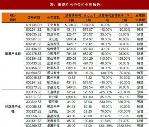 在已发布预告的 22 家消费性电子公司中,有 17 家实现业绩增长。其中增速排名前三的是卓翼科技、硕贝德和东山精密。受益于小米手机及其他新客户、新产品的持续导入、业绩逐步释放,以及募投项目实施后产能扩充及效率提高。卓翼科技半年度净利预告增速达 1832%-2384%;硕贝德将亏损的机壳业务剥离后,上市公司整体盈利能力增加,半年度净利增速 331%-356%;而东山精密净利增速达 110%-155%,主要受益于新产能的释放及前期投资项目陆续产生的效益,导致经营业绩的增长。其他重点公司净利增速方面,工业富联(1%-5%)、立讯精密(15%-25%)、蓝思科技(40%-60%)、欧菲科技(10%-30%)。