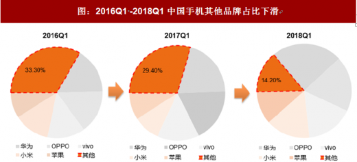 根据报告显示,2018 年一季度,中国beplay下载软件 手机销量同比下滑 21%,跌破 1 亿台至 8750 万台。一季度前四大厂商销量占总出货量的 75%,其中,华为(包含荣耀系列产品)出货量增长 2%,出货量超过 2100 万台,市场份额达 24%;Oppo、Vivo 出分别占据 19%和 16%的市场份额,位列第二、第三。在中国beplay下载软件 手机出货量下滑的趋势下,苹果、华为、OPPO、 VIVO、小米等品牌厂商市场份额进一步提升,未来行业小厂商逐渐被挤出市场,行业集中度有望持续提高,下游品牌的集中也会带动上游零部件厂商也会向龙头集中,未来龙头的价值将进一步体现。