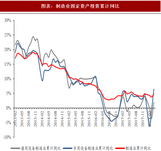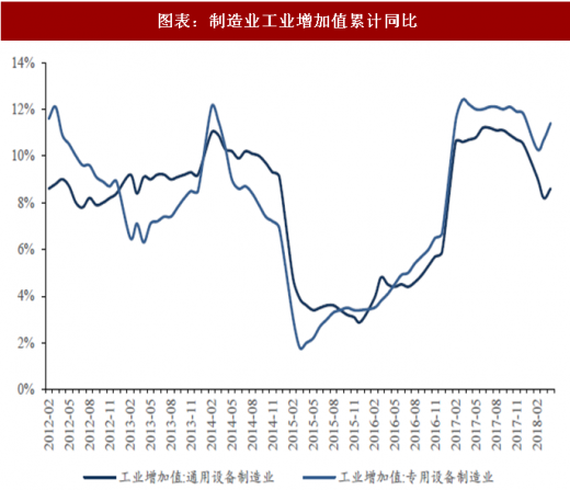 下游需求指标向好:工业增加值4月加速:18年4月份,规模以上工业增加值同比实际 增长7.0%,比3月份加快1.0个百分点;其中通用设备制造业、专用设备制造业增速分别 为9%、11%,均出现一定程度上扬趋势;