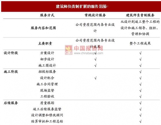 建筑师责任制提供的服务相较常规设计服务,主要的不同体现在施工阶段和后 续服务阶段。常规设计服务在施工阶段仅仅提供设计配合(参与设计交底、设计变 更和补充以及验收配合), 造成设计与建造的割裂, 最终造成工程成果难以完整实 现建筑师的设计理念和理想。 建筑师责任制体制下,建筑师在施工阶段提供的服务 自施工单位招标起至施工合同结束止,贯穿全程,包括审核施工方案、审核施工进 度和计划、审批工程材料和设备、审批施工深化设计、审核施工单位完成的工作量、 批准签发工程付款申请等。
