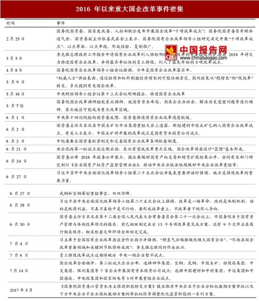 高层讲话/重要会议等重大事件密集持续。2016 年 3 月以来,随“1+N” 配套文件加速落地,国家高层一系列讲话、重要会议和政策文件等密集持续出台,昭示国企改革的框架体系基本搭建完毕。