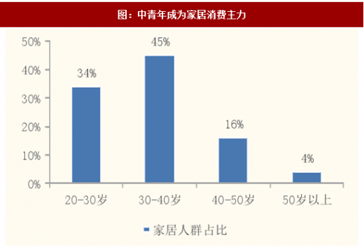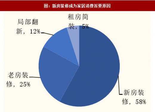 中青年成为家居消费主力,新房装修占比最大:1)购房年轻化推动家居消费年轻化,根据新浪家居发布的《2017中国家居家装消费调查报告》,家居消费人群中20~40岁的中青年是家居消费的主力军,占比高达79%,远高于其他年龄段人群总和的近4倍;2)调查报告数据显示,首次装修是中国家庭的家居消费第一位原因,约58%的消费者装修的原因是新房装修。