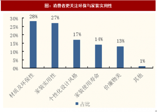 家装消费需求升级1—环保与实用性优先于个性化需求:1)环保优先关注:消费者群体中高学历群体占比高,消费者群体更加成熟,这部分人群对于家装更加看重材质及环保性。2)实用性优先关注:考虑家装的大多数人是首次购房以及中青年群体经济实力有限因素,我们认为家装消费群体对家装实用性同样重视;3)根据新浪家居发布的《2017中国家居家装消费调查报告》,55%的家装消费者首要关心环保和实用,尽管“新世代”消费群体非常喜欢个性化的事物,但是对于标准化且高质量的产品同样具有较高的接受程度。