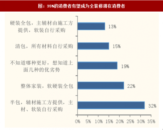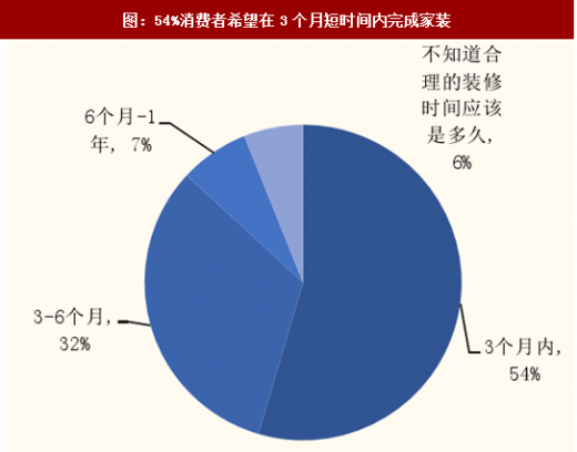 家装消费需求升级2—一体化服务需求高:1)“新世代”消费群体由于正处于为生活奔波的年龄阶段,工作时间长,时间成本高,很难再同上一代人对家装亲力亲为。因此我们认为:相比上一代消费者“货比三家”的消费习惯,新一代消费者在家居消费过程中,更倾向于“一站式、一体化”服务。2)《2017中国家居家装消费调查报告》数据显示,超过50%的消费者希望家装在3个月内完成,35%的消费者硬装全包(22%的消费者愿意整体家装+13%的消费者原因硬装全包)(这些客户有望成为全装修的消费群体),这印证家装“一体化”服务的需求高的特点。