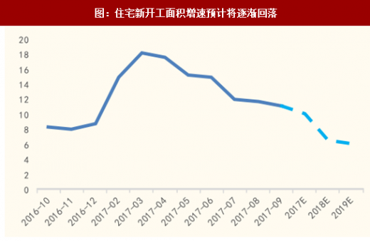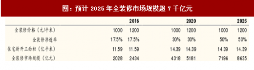 预计2017/2018/2019年住宅新开工面积同增10%/6.5%/6%:1)为了预测新房全装修未来市场规模,我们首先必须判断新房新开工面积增速趋势。截止到2017年9月,今年的土地购置面积仍保持在12%以上的同比增速。从拿地到新开工的周期时间看,未来新开工增速有一定保证,17年年底预期住宅新开工增速10%。2)销售方面,截至9月住宅销售面积增速7.6%,2017全年住宅销售面积预期增速7%。在未来房地产长效机制的推行下,地产销售增速仍将逐渐回落,保持较平稳的增长,我们预期2018/2019年住宅销售面积同增3.5%/1%。3)考虑到明后年开发商对销售预期谨慎,预测2018/2019年新开工面积同增6.5%/6%,而在2020-2025年,我们假设地产新开工面积维持0增长。