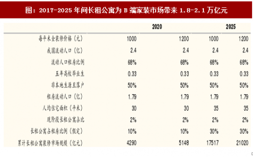 2017-2025年间长租公寓为B端家装市场带来1.8-2.1万亿元:1)政策助推下,长租公寓发展前景巨大,现阶段长租公寓供求缺口较大为家装公司创造巨大增量需求;2)假设2020年我国长租公寓新开工面积可满足10%的租房人口的需求,参考社科院的《中国经济体制改革报告2013》预计到2020年我国城市人均住宅面积达35平米,保守预计租客人均住宅面积约30平米;3)假设2025年我国长租公寓新开工面积可满足30%的租房人口的需求,预计租客人均住宅面积约35平米;4)考虑长租公寓装修以全装修/精装修为主,精装修价格更高,下面我们按照全装修价格预估长租公寓为装饰市场贡献市场空间,假设全装修每平米装修价格在1000-1200元,预计2017-2020年间长租公寓为B端家装市场带来4290-5148亿元市场空间,预计2017-2025年间长租公寓为B端家装市场带来17517-21020亿元。