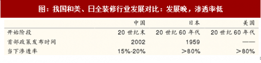 我国全装修市场发展晚,空间巨大:1)我国住宅全装修政策发展始于2002年《商品住宅装修一次到位实施细则》,和日本(20世纪60年代)等发达国家相比,起步较晚,发展滞后,全装修市场正处成长期;2)现阶段我国全装修渗透率不足20%,北上等一线城市渗透率可达50%,单相较于发达国家80%的渗透率成长空间巨大