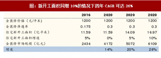 根据我们前面的预测,新开工面积四年CAGR达5.6%,在现阶段全装修渗透率17.5%的情况下,在新开工面积复合增速0%/5%/10%的情况下对应全装修市场规模四年CAGR达14%-26%。
