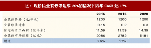 根据我们前面的预测,预计2020年地产新开工面积为14.39亿平米,现阶段全装修渗透率15%-20%的情况下对应全装修市场规模四年CAGR达17%-26%。