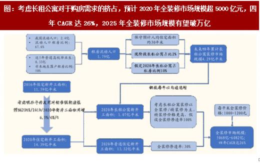 考虑长租公寓对购房需求的挤出效应,全装修市场规模2017-2020年四年CAGR达26%,2025年有望破万亿