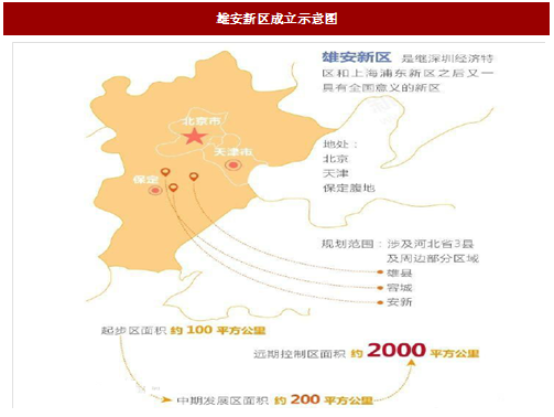 2017年4月1日,中共中央、国务院印发通知,决定设立河北雄安新区。“雄安新区”规划范围涉及河北省雄县、容城、安新3县及周边部分区域,地处北京、天津、保定腹地,规划建设以特定区域为起步区先行开发,起步区面积约100平方公里、中期发展区面积约200平方公里、迖期控制区面积约2000平方公里。而同时,央媒以“千年大计、国家大事”论述此举,规格空前
