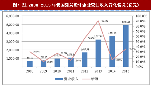 受固定资产投资规模的逐年增加以及下游的居住建筑、商业建筑、公共建筑的大量建设需求,我国建筑设计企业营业收入逐年上升,从2008年的686亿元提升至2015年的4,948亿元,年复合增长率高达32.61%0
