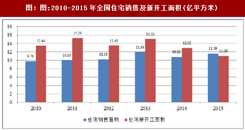 居住建筑是建筑业的重要组成部分,2015年我国住宅销售面积高达11.59亿平方米,同比增长7.08%,从2010年至2015年住宅销售面积年复合增长率达3.50%;2015年我国住宅新开工面积为11亿平方米,同比下降14.35%,但仍然超过或接近历年住宅销售面积。