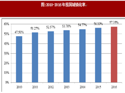根据国家统计局数据,我国城镇化率由2010年的47.50%提升至2016年的57.35%0“十三五规划”纲要提出,到2020年我国城镇化率将达到60%,中国社会科学院发布的《城市蓝皮书:中国城市发展报告No.8》指出,预计到2030年我国城镇化率将达到70%左右。