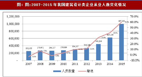 随着建筑设计行业市场规模的提升,我国建筑设计行业从业人员保持较快的增长速度,从2007年的25.25万人上升至2015年的99.72万人,年复合增长率达18.73%。