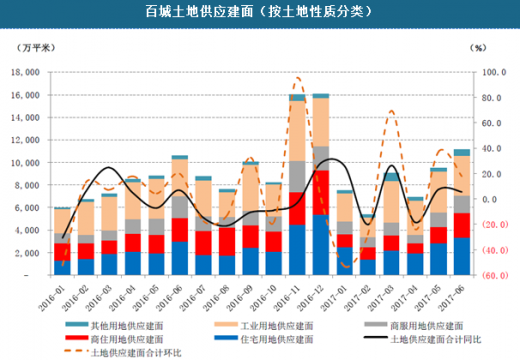 2017年6月,百城各类型土地合计供应建面11,148万平米,环比+17.6%,同比+5.6%,前6月累计同比+3.6%。其中,分用地性质土地供应建面占比来看,住宅用地30.1%、商住用地19.6%、商服用地13.6%、工业用地31.5%;分用地性质土地供应建面环比来看,住宅用地+18.5%、商住用地+55.6%、商服用地+11.2%、工业用地-3.0%;分用地性质土地供应建面同比来看,住宅用地+12.8%、商住用地+5.1%、商服用地-22.3%、工业用地+7.2%;分用地性质土地供应建面累计同比来看,住宅用地+22.0%、商住用地-13.9%、商服用地-6.0%、工业用地-1.0%。