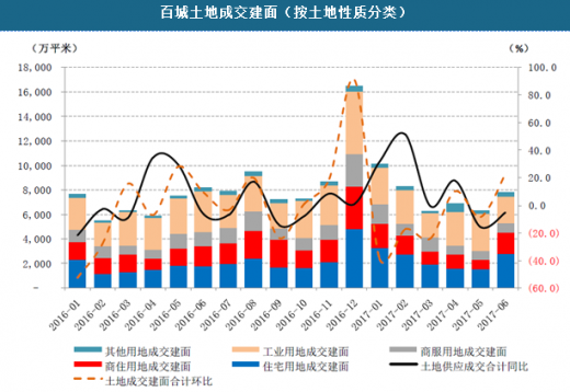 2017年6月,百城各类型土地合计成交建面7,755万平米,环比+22.8%,同比-5.3%,前6月累计同比+11.2%。其中,分用地性质土地供应建面占比来看,住宅用地36.0%、商住用地21.8%、商服用地10.6%、工业用地28.0%;分用地性质土地成交建面环比来看,住宅用地+83.5%、商住用地+128.3%、商服用地+7.9%、工业用地-28.4%;分用地性质土地成交建面同比来看,住宅用地+60.6%、商住用地-0.5%、商服用地-28.2%、工业用地-34.5%;分用地性质土地成交建面累计同比来看,住宅用地+41.5%、商住用地+0%、商服用地+3.5%、工业用地-2.5%。