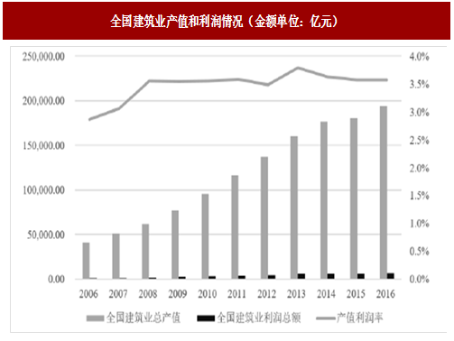 2006 年至2016 年,我国建筑行业产值、企业利润总额和产值利润情况如下表所示: