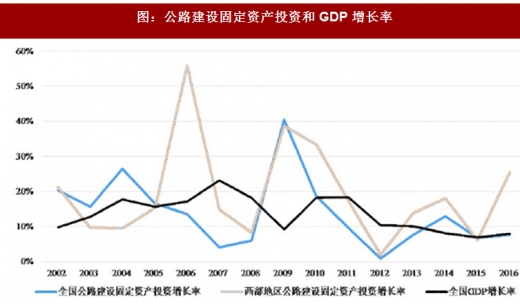 路桥施工行业的景气度取决于公路交通固定资产投资需求状况,而投资需求受到宏观环境的显著影响,因此行业是典型的周期性行业,与我国国民经济的发展具有较强的关联度,我国公路建设固定资产投资增长率及西部地区公路建设固定资产增长率与全国GDP 增长率如下图所示:
